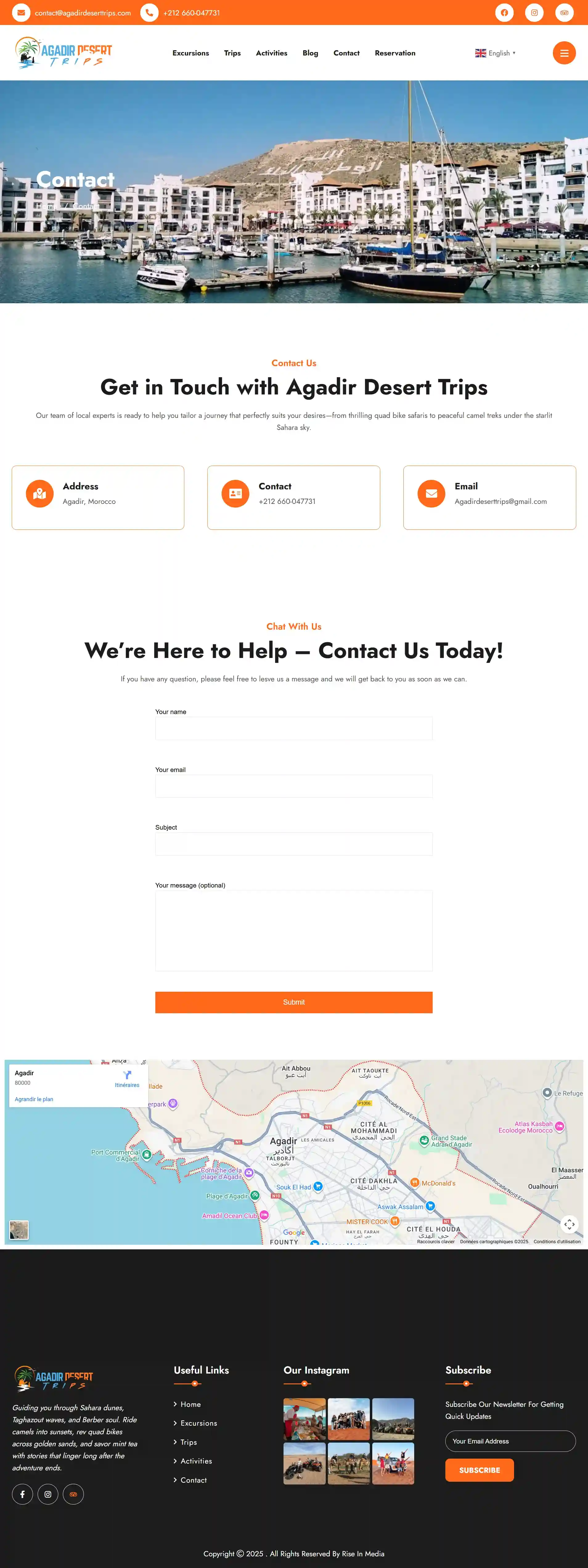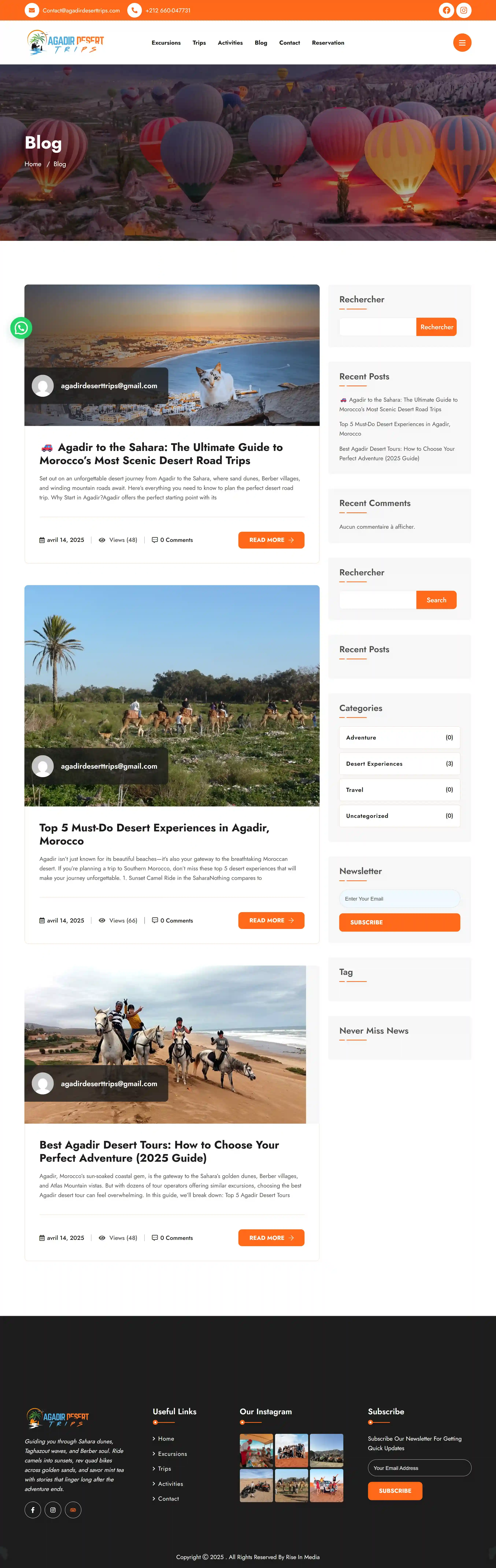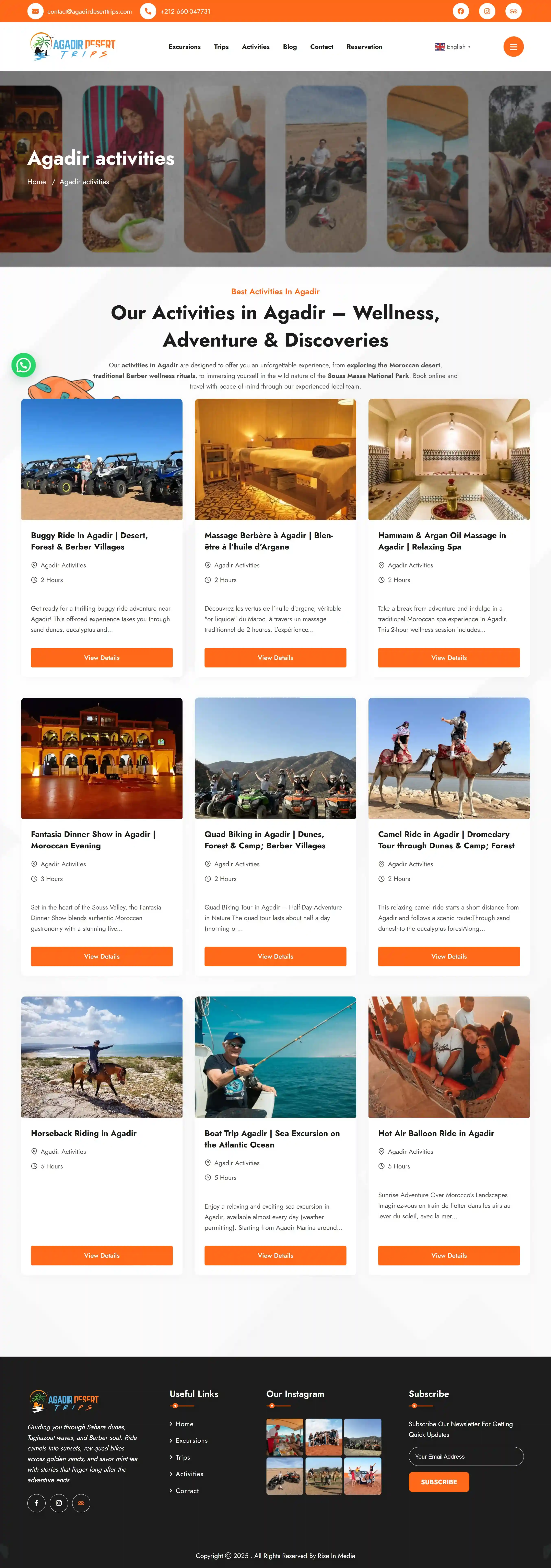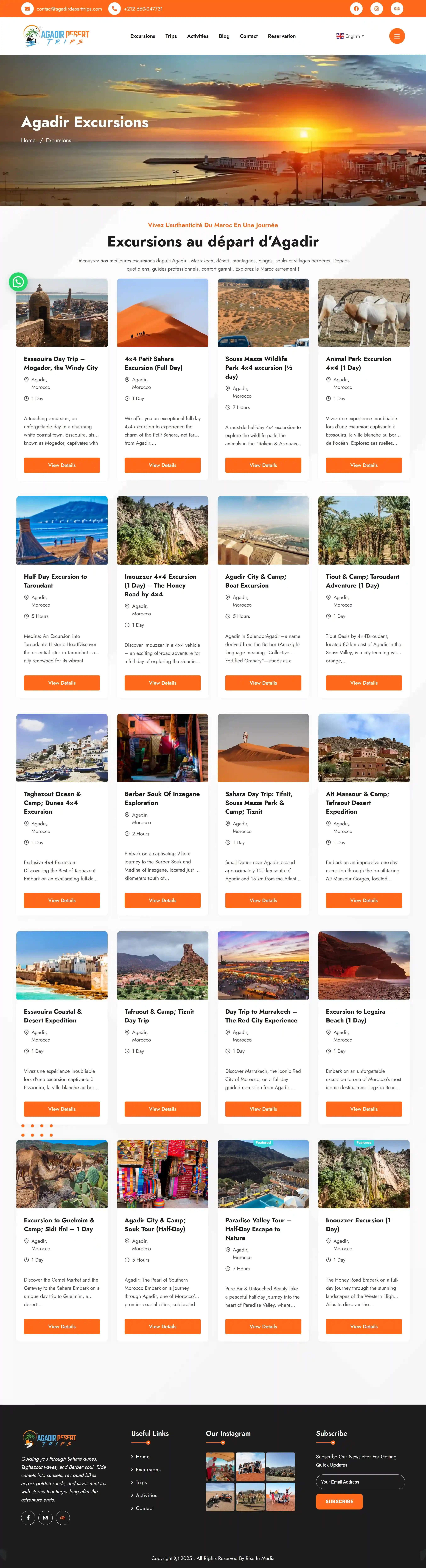 Un site web de voyage polyvalent conçu pour une agence basée à Agadir proposant des excursions dans le désert, des visites guidées et diverses activités de plein air destinées à aider les visiteurs à découvrir les paysages et les sites culturels marocains.